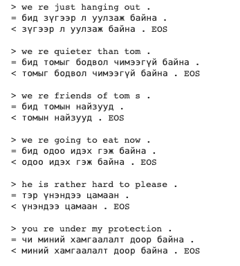 In this group project, we implement the Natural Language Processing (NLP) model for English to Mongolian translation. Today, sequence-to-sequence (seq2seq) models are becoming very widespread and provide very high quality and almost excellent performance in a wide variety of tasks. We used a deep neural network, sequence-to-sequence module was built using the PyTorch library, with an encoder, decoder, and attention. In other words, we can say that seq2seq models constitute a common framework for solving sequential problems, like Google Translate, online chatbots, text summarization, speech-to-text conversion, and speech recognition in voice-enabled devices.
